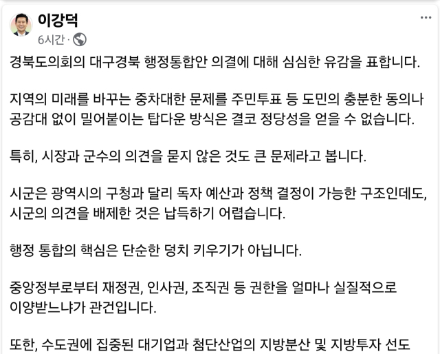 경북도지사 출마를 준비 중인 이강덕 포항시장이 지난 28일 경북도의회의 ‘대구경북 행정통합안 의결’과 관련해 “도민의 충분한 동의와 공감대 없이 추진된 전형적인 탑다운 방식”이라며 강한 유감을 표명했다.