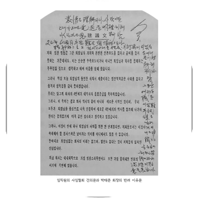 “충정은 이해하나 사람이란 때가 되면 진퇴를 명확히 해야 한다고 사료됨. 24년 6개월의 고난은 신체적으로나 정신적으로도 견디기 어려울 정도의 타격이 되었음을 여러분이 이해해주기 바람. 그동안 여러 임직원이 고난과 시련을 함께 견뎌내고 포철의 오늘을 있게 해주신 협조에 대해 만강의 경의를 표합니다.”
