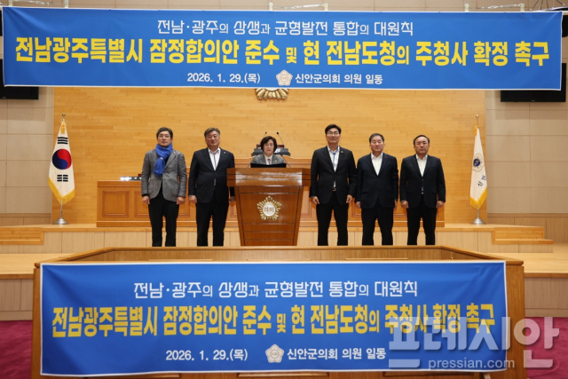 한편 신안군의회(의장 이상주)도 같은 날 신안군의회 본회의장에서 전남·광주 행정통합과 관련해 '전남광주특별시 잠정합의안 준수 및 현 전라남도청 주청사 확정 촉구 결의문'을 채택했다.