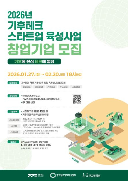 지원 대상은 기후 관련 혁신 기술을 보유한 창업 7년 이내 스타트업으로, 오는 20일 오후 6시까지 온라인을 통해 신청하면 된다. 최종 선정 결과는 2월 말 발표될 예정이다.