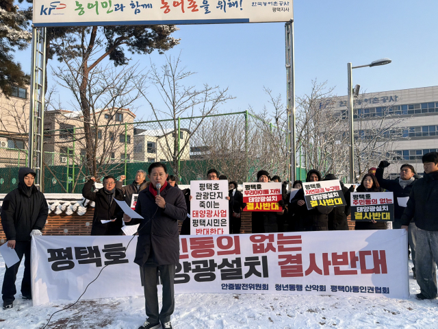한국농어촌공사가 평택호 내수면 일대에 대규모 태양광 발전 시설 건립을 추진하고 있는 가운데 지역주민들이 2일 반대 집회를 열고 사업 철회를 촉구했다.