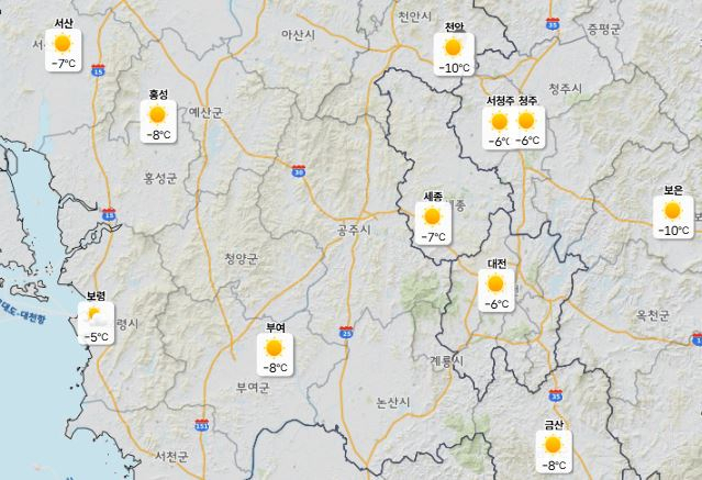 3일 낮 최고기온은 대전 4도, 세종·청주 6도, 천안 5도, 아침 최저기온은 -9도 수준으로 예보됐다.