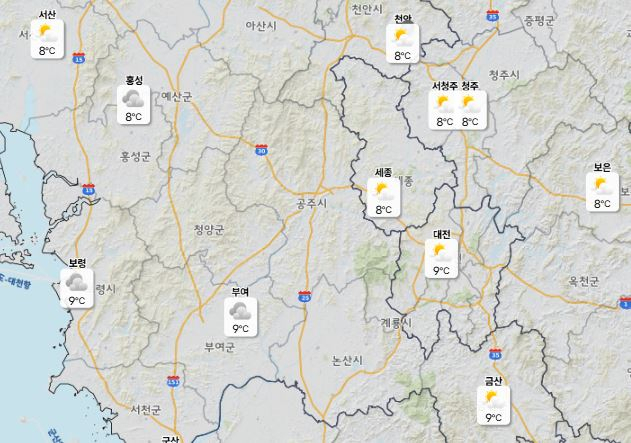 이날 낮 최고기온은 대전 7도, 세종·청주·천안 8도로 예보됐으며 아침 최저기온은 -4도 수준이다.