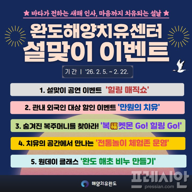 완도군은 설 명절을 맞아 귀성객·군민·관광객이 그동안 쌓인 피로를 풀고 활력을 얻을 수 있도록 '완도해양치유센터, 설맞이 힐링 이벤트'를 오는 2월 5일부터 22일까지 운영한다고 4일 밝혔다.