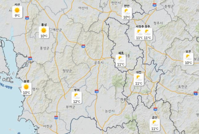 이날 낮 최고기온은 대전·천안 10도, 세종·청주 11도로 예보됐으며 아침 최저기온은 -1도 안팎에 머물 전망이다.