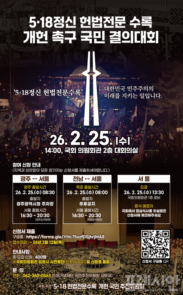 광주광역시(시장 강기정)는 전국 시민사회단체, 종교계, 오월단체, 광주시, 전남도 등으로 구성된 '5·18 헌법전문 수록 개헌 국민추진위원회'가 오는 25일 오후 2시 국회 의원회관 2층 대회의실에서 '5·18정신 헌법전문 수록 개헌 촉구 국민결의대회'를 개최한다고 4일 밝혔다.