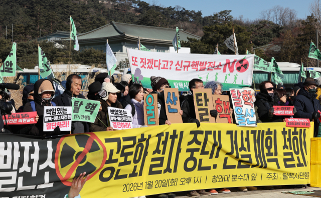 ▲탈핵시민행동 소속회원들이 20일 서울 청와대 분수대 주변에서 신규핵발전소 공론화 절차 중단 및 건설계획 철회 요구 기자회견을 하고 있다. ⓒ연합뉴스