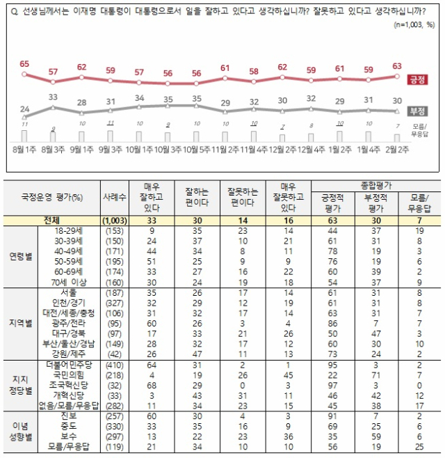 이재명 대통령의 국정운영에 대해 '잘하고 있다'는 긍정 평가가 63%로 나타났다. 2주 전 조사에 비해 4%포인트(P) 상승해 다시 60%대를 회복한 수치이며 부정 평가는 1%P 하락한 30%로 집계됐다.