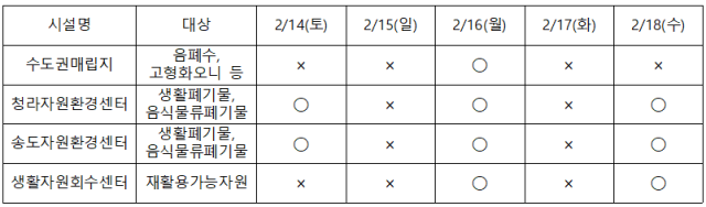 송도자원환경센터와 청라자원환경센터는 15일과 설 당일인 17일을 제외한 연휴 기간 동안 반입을 허용하며, 수도권매립지는 16일 하루에 한해 반입이 가능하다. 다만 수도권매립지 반입은 공휴일 반입을 허용하되, 직매립 금지 원칙은 현행대로 유지된다.