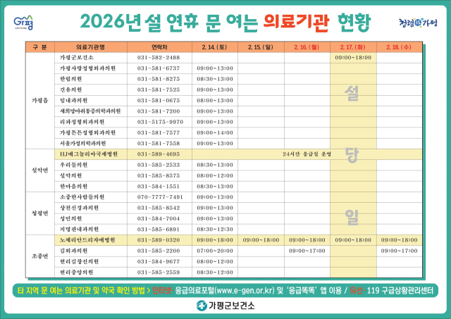 아울러 가평군은 설 연휴 동안 운영하는 의료기관, 약국 정보를 사전에 안내하고 있다. 연휴 기간 문을 여는 의료기관 및 약국 정보는 ▲가평군청 및 가평군보건소 홈페이지 ▲119구급상황관리센터 ▲응급의료포털 ▲보건복지콜센터(129)에서 확인할 수 있다.