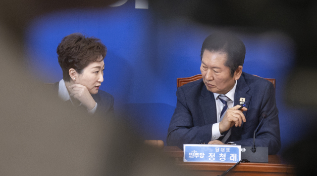 ▲더불어민주당 정청래 대표와 이언주 최고위원이 9일 국회에서 열린 최고위원회의 도중 대화하고 있다. 026.2.9 ⓒ연합뉴스