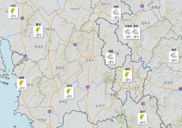 이날 낮 최고기온은 대전·청주·천안 6도, 세종 7도, 아침 최저기온은 -4도로 예상된다.