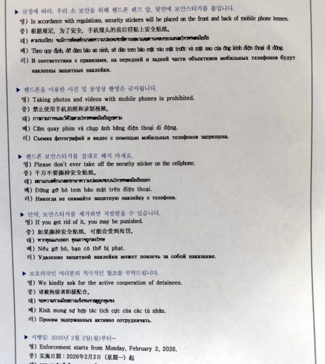 법무부는 지난 2일부터 전국 외국인보호소·보호실의 구금(보호) 외국인의 휴대전화 카메라 사용을 금지했다. 휴대전화엔 상시 보안스티커를 붙여놔야 하며, 이를 제거하면 처벌받을 수 있다고 밝혔다. 벤자민 씨는 '독방 처벌을 받을 수 있다'는 경고를 보호소 직원에게서 들었다.