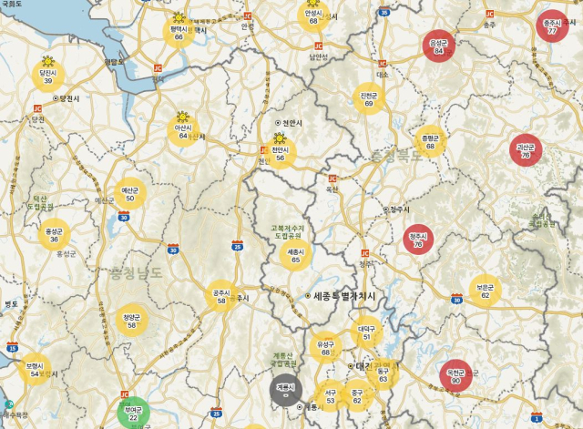 특히 충북 청주·음성·괴산·충주·옥천에는 ‘매우 나쁨’ 수준까지 치솟았다.