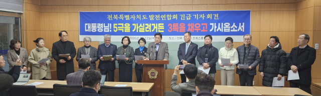 전북특별자치도발전연합회(회장 최한양)는 12일 전북도의회에서 입장을 밝히고, 농정기관 이전과 새만금 개발 가속, 광역 교통망 확충, 프로야구단 유치 등 4대 과제를 국정 우선순위로 채워 달라고 요구했다.