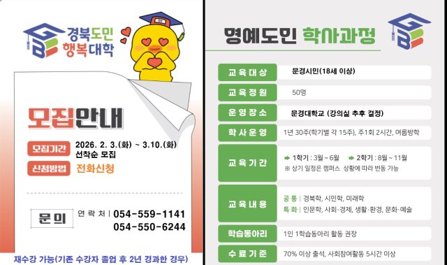 경북 문경시는 시민들에게 체계적이고 수준 높은 평생학습 기회를 제공하기 위해 2026년『경북도민행복대학 문경시캠퍼스』명예학사과정 입학생을 3월 10일까지 선착순 모집한다.