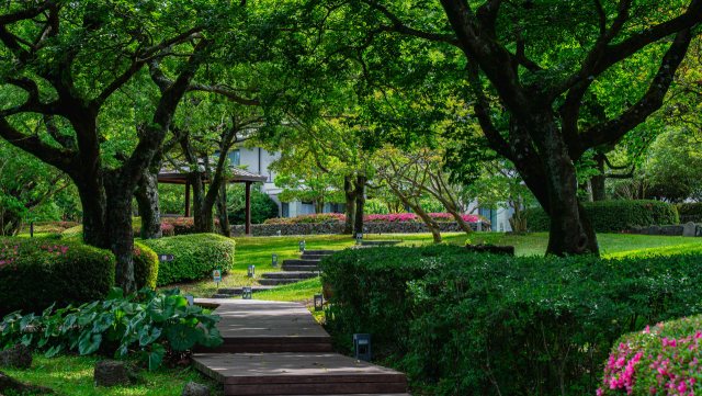 제주 특유의 탁 트인 전경과 남쪽 숲의 수림이 조화를 이루며, 제주 지역에서만 볼 수 있는 수목들이 진입로부터 이국적인 분위기를 연출한다.