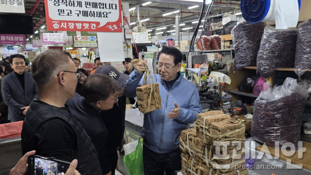 김영록 전남지사가 설 명절 하루 전인 13일 광양 중마상설시장을 찾아 지역사랑상품권으로 장을 보며, 상인들의 애로 사항을 청취했다.