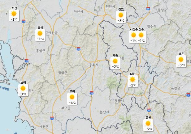이날 낮 최고기온은 대전·천안 6도, 세종·청주 7도로 예보됐으며 아침 최저기온은 -3도로 다소 쌀쌀하겠다.
