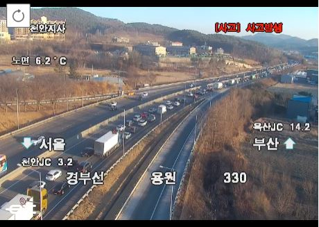이어 오후 5시23분부터는 경부고속도로 부산방향 천안독립기념관 부근 1-2차로에서 승용차 사고가 발생해 정체가 이어지고 있다.