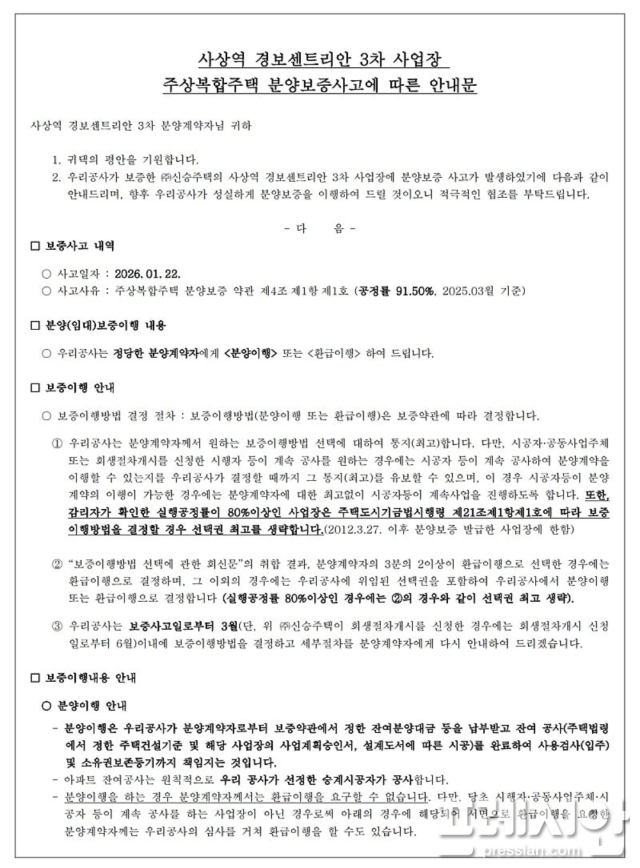 지역 건설업계 관계자는 "공정률이 높아도 자금경색이 길어지면 현장은 멈출 수밖에 없다"며 "중소 시행사와 건설사가 먼저 위기에 노출되고 있다"고 전했다. 분양보증 사고가 잇따를 경우 지역 부동산시장과 고용시장에 미치는 파장은 더욱 커질 수 있다는 우려가 나온다.