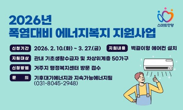 경기 안양시는 여름철 폭염에 대비해 저소득 취약계층을 대상으로 벽걸이형 에어컨을 무상 설치하는 ‘2026년 폭염 대비 에너지복지 지원사업’을 추진중이라고 19일 밝혔다.