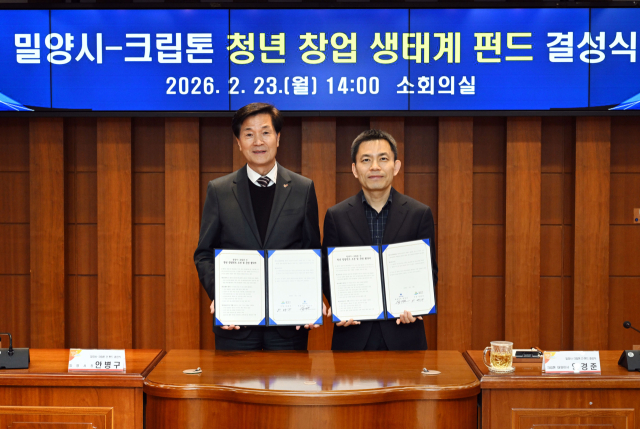 밀양시는 23일 시청 소회의실에서 국내 창업기획자(AC)인 ㈜크립톤과 함께 131.1억 원 규모의 '크립톤 지역 창업 생태계 라이콘 펀드' 결성식을 개최했다고 밝혔다.