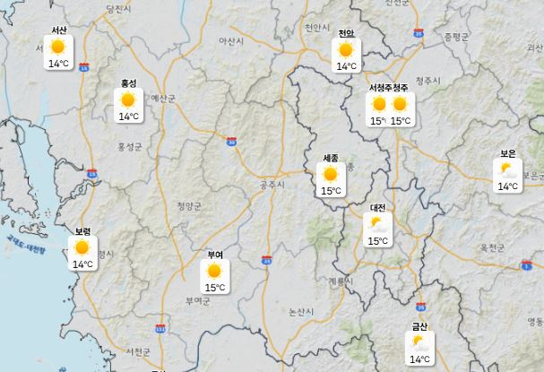 이날 낮 최고기온은 대전 13도, 세종·청주 15도, 천안 14도로 예보됐으며 아침 최저기온은 -2도 안팎에 머물 것으로 예상된다.
