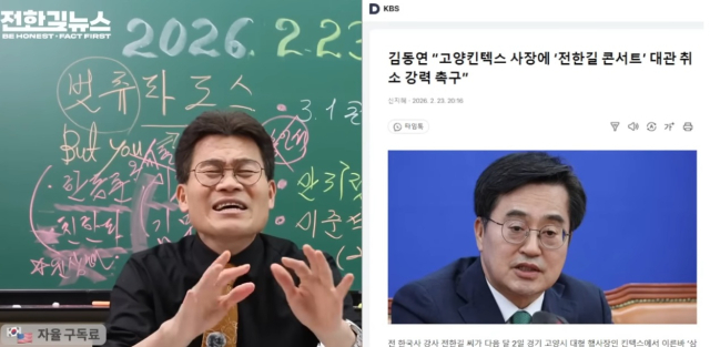전 씨는 24일 자신의 유튜브 <전한길뉴스> 영상을 통해 전 씨가 주도하는 콘서트가 열릴 예정이었던 킨텍스에 김동연 경기도지사가 대관 취소를 강력 촉구했다는 기사를 공유하고 "야 김동연 너 할 일 그래 없냐. 경기도지사라는 사람이 전한길이 그렇게 두렵나"라고 반말로 말했다.