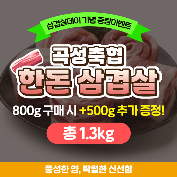 이벤트 기간에 곡성군 고향사랑기부자는 한돈 삼겹살을 답례품으로 선택하면 기존 800g에서 500g을 더해 총 1.3㎏을 받을 수 있다.