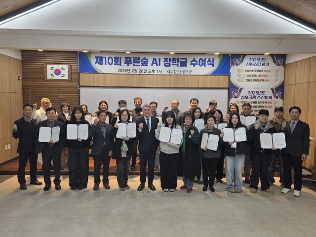 고창군산림조합(조합장 김영건)은 26일 ‘제10회 푸른숲 AI장학금’ 수여식을 개최하고 조합원 자녀 25명에게 장학증서와 함께 총 1,750만 원의 장학금을 전달했다.