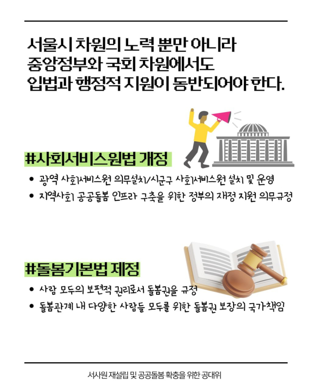 위에 언급한 과제들은 서울시 차원의 노력만으로는 풀 수 없는 것들이다. 중앙정부와 국회 차원에서 입법과 행정적 지원 등이 동반되어야 새로운 서울시의 노력이 빛을 발할 수 있다. 지역사회통합돌봄 국면에서 사회서비스원의 역할과 책임을 재규정하고, 광역 사회서비스원의 의무설치, 시군구 사회서비스원 설치 및 운영을 위한 근거 규정 포함, 지역사회 공공돌봄인프라 구축을 위한 정부의 재정 지원 의무 규정 등을 포함한 사회서비스원법의 개정은 사회서비스원 리부트를 위해서도, 지역사회통합돌봄의 성공적 전국화를 위해서도 필수적인 과제이다. 더 나아가 사람 모두의 보편적 권리로서 돌봄권을 규정하고 돌봄 관계 내 다양한 사람들 모두의 돌봄권 보장을 위한 국가의 책임과 역할을 규정하는 돌봄기본법의 제정 또한 더 이상 미룰 수 없는 과제이다.