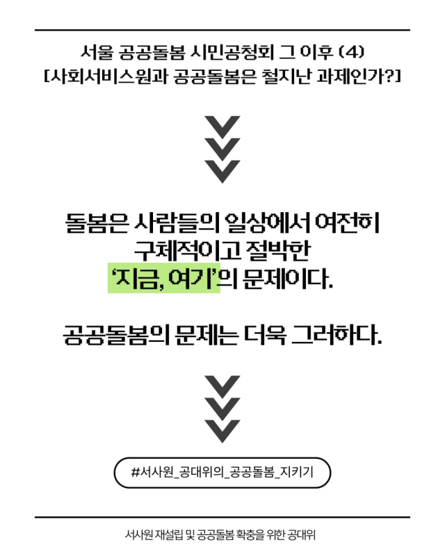사회서비스원과 공공돌봄, 오랜 기간 논의를 통해 우여곡절을 겪어온 과제인 만큼 다가온 선거의 장에서 그다지 매력적이지 않은 '철 지난' 의제처럼 보일 수 있다. 하지만 돌봄은 사람들의 일상에서 여전히 구체적으로 절박한 문제이고, 여전히 '지금, 여기'의 문제이다. 퇴행의 깊은 계곡을 경험한 서울시의 사회서비스원과 공공돌봄의 문제는 더욱 그러하다.