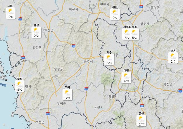 이날 낮 최고기온은 대전 13도, 세종·청주·천안 14도로 예보됐으며 아침 최저기온은 2도 안팎에 머물 전망이다.