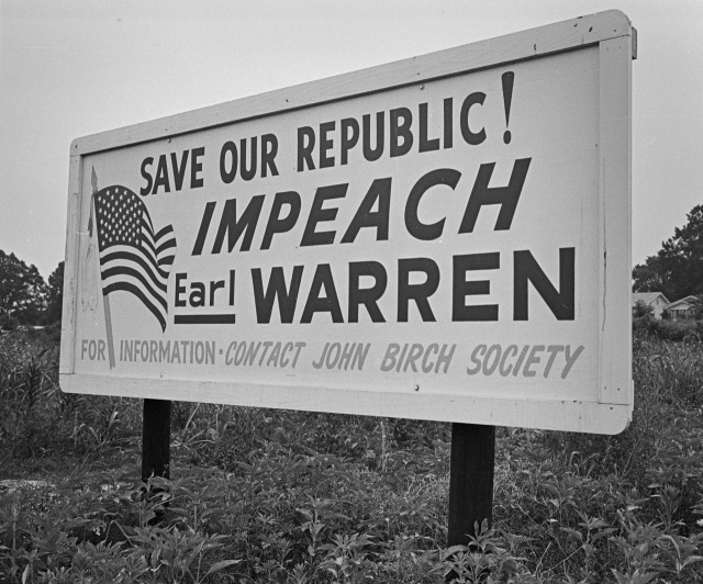 JBS와 웰치의 의심은 행정부를 넘어 사법부를 향하기도 했다. 대상은 공립학교에서의 인종분리는 위헌이라는 1954년 연방대법원 판결의 주역 얼 워렌 대법원장이었다. 웰치에게 54년 결정은 "반(反)헌법적"이며 "친(親)공산주의적"이었다. JBS는 워렌 대법원장에 대한 탄핵운동을 주도하기도 했는데, 그들이 내세운 근거는 대법원장이 공산주의자들에게 "끊임없는 도움"을 주고 있으며, 연방대법원이 공산주의자들의 영향 아래 정해진 절차를 무너뜨릴 뿐만 아니라 공산주의적인 목적을 위해 헌법의 빈틈을 악용하고 있다는 허황된 주장이었다.