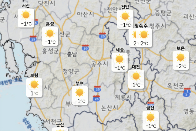 이날 낮 최고기온은 대전·천안 11도, 세종·청주 12도로 예보됐으며 아침 최저기온은 -1도로 일교차 큰 날씨가 예상된다.