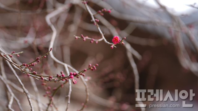 국가유산 천연기념물인 '구례 화엄사 화엄매'가 6일 첫 꽃망울을 터뜨리며 산사에 찾아온 봄 소식을 알렸다.