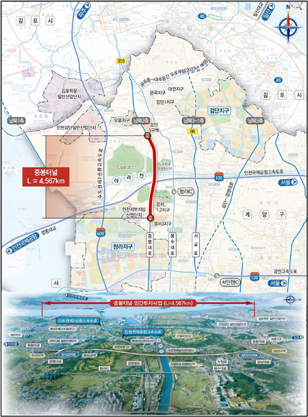 인천광역시가 서구 경서동 경서삼거리에서 왕길동 검단2교차로를 연결하는 중봉터널 민간투자사업의 우선협상대상자를 선정했다.