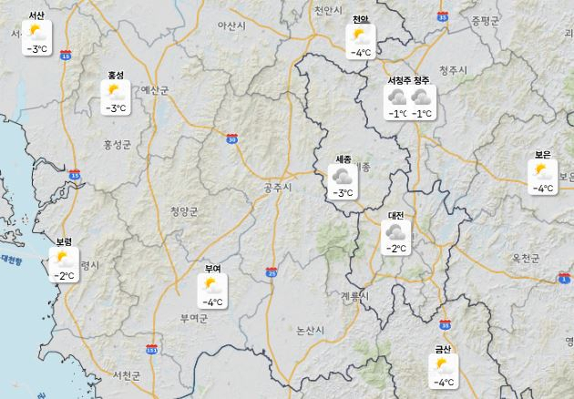 이날 낮 최고기온은 대전 9도, 세종·청주·천안 10도로 예보됐으며 아침 최저기온은 -3도로 나타나 10도 이상의 큰 일교차가 예상된다.