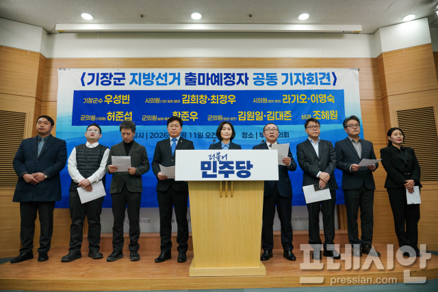 더불어민주당 기장군 출마예정자 일동은 11일 오전 부산시의회에서 기자회견을 통해 합동 출마를 선언했다. 이날 회견에는 우성빈 기장군수 출마예정자, 김희창·최정우 부산시의원(기장1) 출마예정자, 라기오·이영숙 부산시의원(기장2) 출마예정자와 김대준, 김원일, 황준우 기장군의원 출마예정자, 조혜원 비례후보 출마예정자가 함께했다.