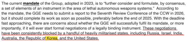문 : 대부분의 방해국은 무기 산업이 활성화된 국가다. 이 점이 핵심 아닐까 싶다. 특히 미국은 자체 훈령(DoDD 3000.09)으로 자율 살상 무기체계 지침을 두고 있다는 이유로, '국가별 규제로도 충분하니 강한 국제 규범은 필요하지 않다'고 한다. 미국이 이렇게 나가면, 자신들의 무기 시장 활성화나 투자 계획을 계산하는 싱가포르, 한국, 일본 등도 이를 어느 정도 지지하고 나선다.