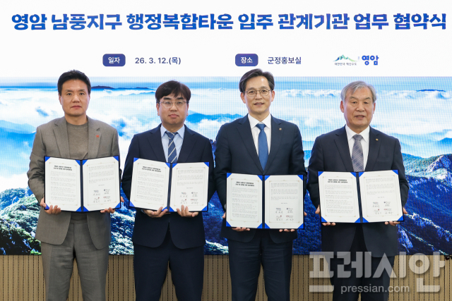13일 군에 따르면 전날 군청에서는 서부지방산림청 영암국유림관리소, 국민건강보험공단 영암지사, NS종합건설과 '남풍지구 행정복합타운 입주 업무협약'이 열렸다.