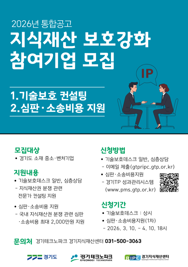경기테크노파크는 13일 ‘2026년 지식재산 보호강화’ 사업에 대한 참여기업을 모집한다고 밝혔다.