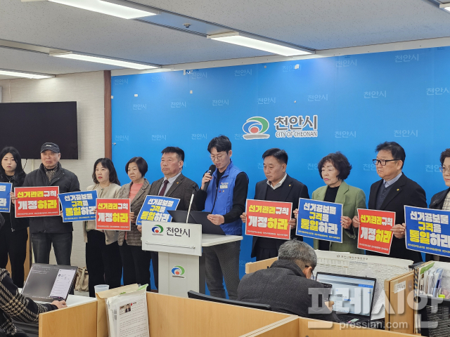 이영준 위원장을 비롯한 노조 관계자들과 이통장협의회, 새마을회 관계자들은 16일 천안시청 브리핑실에서 기자회견을 열고 선거공보물 규격 통일 또는 최소 기준 마련을 위한 선거관리규칙 개정을 요구했다.