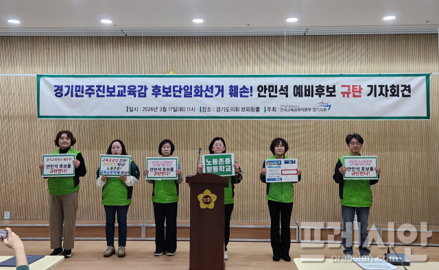 17일 경기교육혁신연대에 참여 중인 전국교육공무직본부 경기지부(경기교육공무직본부)는 긴급 기자회견을 열고 "경기교육의 혁신과 진보성향 후보단일화를 위한 정당한 활동을 탈법·불법으로 규정한 안민석 예비후보는 사퇴하라"고 촉구했다.