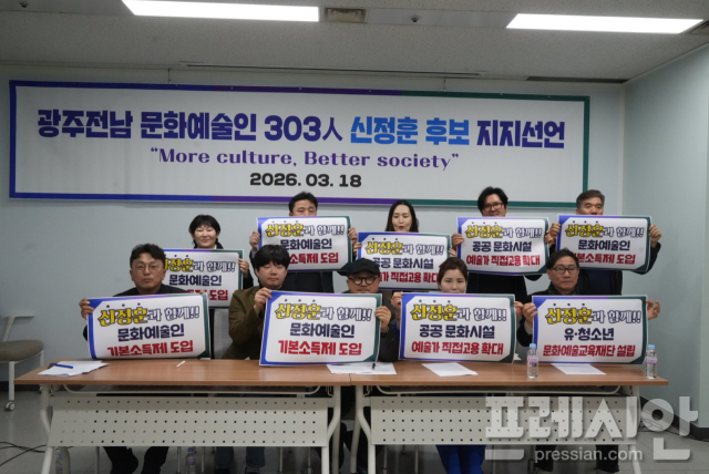 이날 지역문화예술인 303인의 공동성명을 통해 "초광역 지방정부 출범이라는 모멘텀을 지역문화예술정책 진화의 획기적 기회로 삼아야 한다"며 "일관되게 진보정치의 길을 걸어온 민주주의자 신정훈 의원을 지지하기로 결의했다"고 밝혔다.