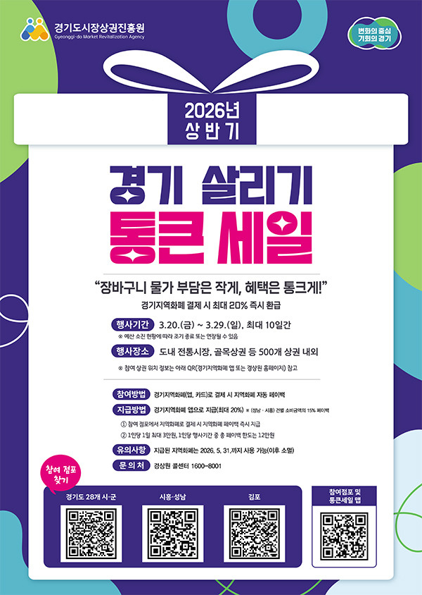 경기도와 경기도시장상권진흥원이 소비진작과 지역상권 회복을 위한 페이백 이벤트 행사 ‘2026년 상반기 경기살리기 통큰세일’을 3월 20일부터 29일까지 10일 간 개최한다.