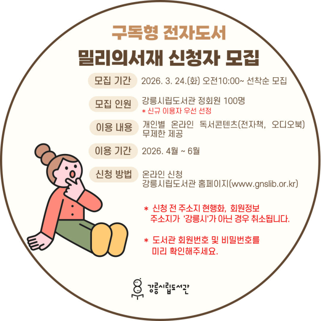 강릉시립도서관은 시민들의 독서 접근성을 높이고 다양한 독서 기회를 제공하기 위해 구독형 전자도서 서비스 ‘밀리의 서재’ 2분기 이용자 100명을 선착순으로 모집한다.