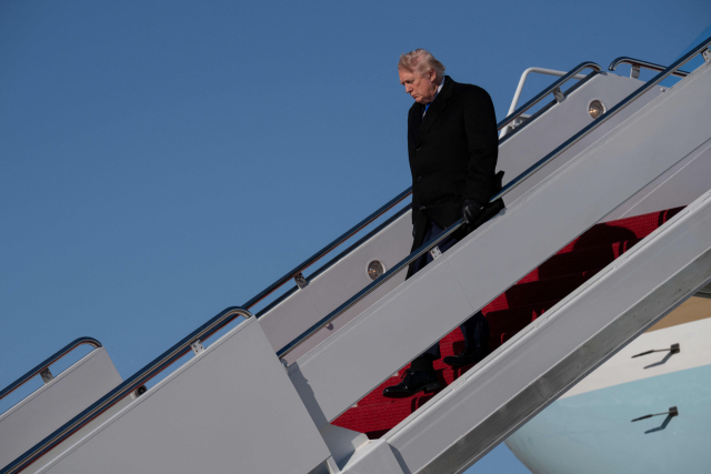 ▲23일(현지시간) 미국 메릴랜드주 앤드루스합동기지에 도착한 도널드 트럼프 미국 대통령이 전용기(에어포스원)에서 내리고 있다. ⓒAFP=연합뉴스