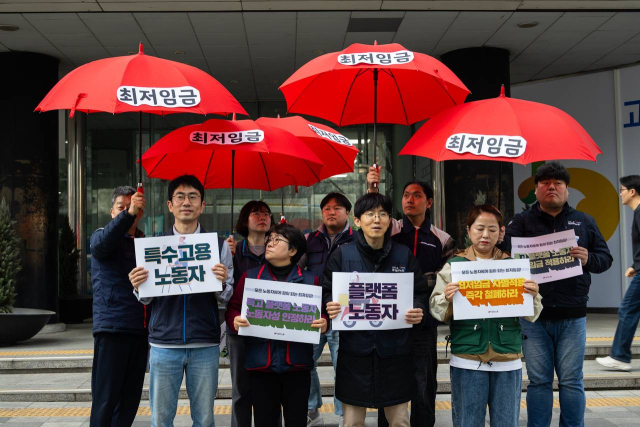 ▲ 민주노총 조합원들이 3월 23일 서울 중구 서울지방고용노동청 앞에서 '특수고용·플랫폼 노동자 최저임금 적용과 제도 개선 촉구' 기자회견을 열고, 김영훈 노동부 장관에게 2027년 적용 최저임금에 특고·플랫폼 노동자 적용을 포하라고 요구했다. ⓒ민주노총